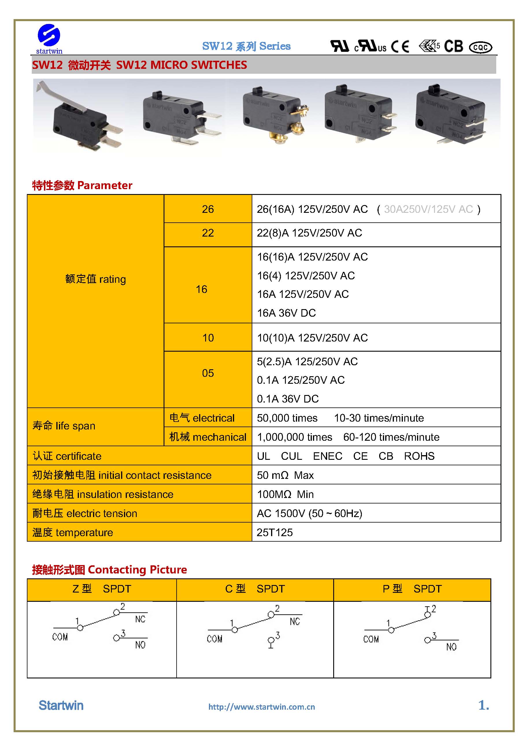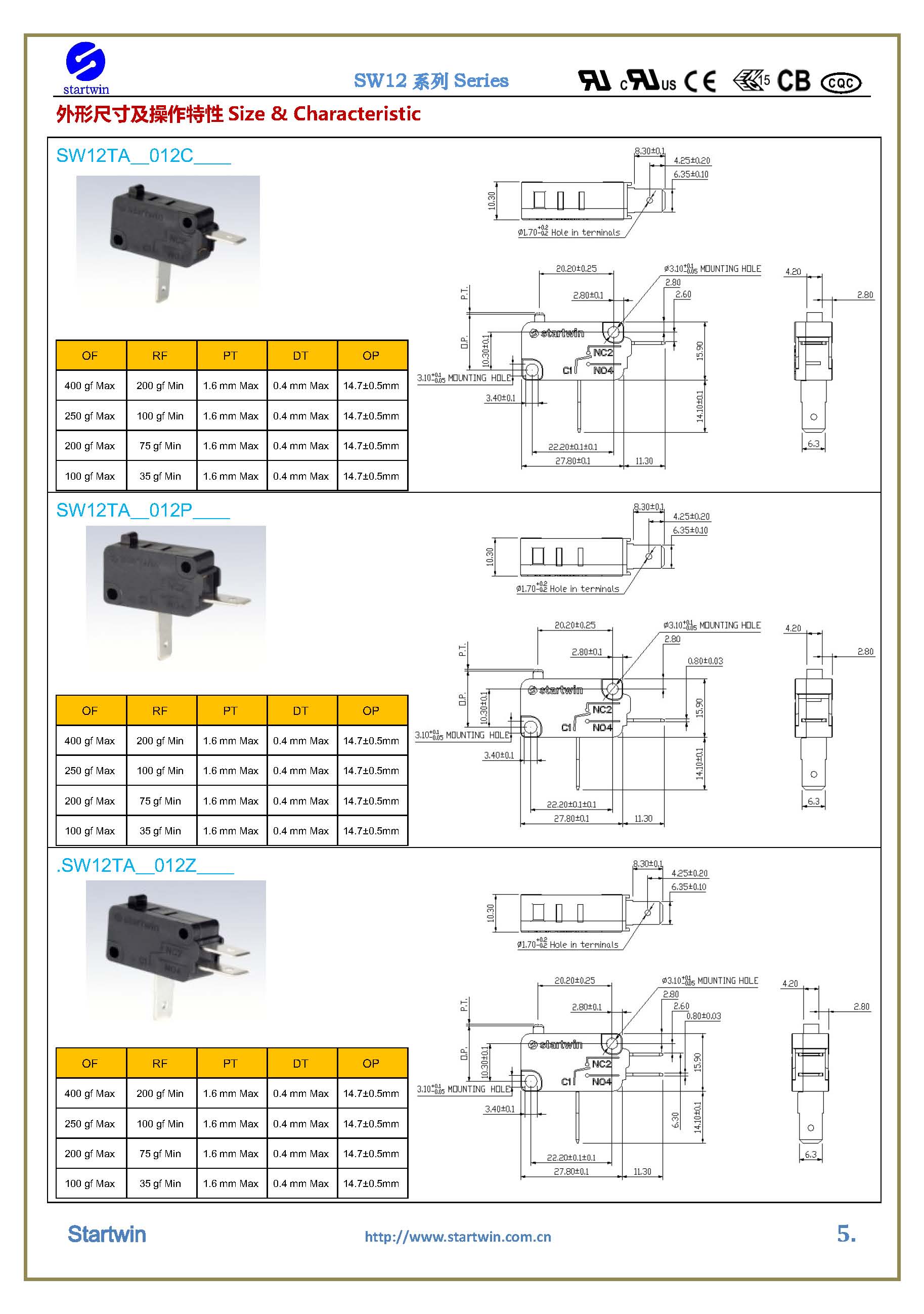 产品型号:SW12TA-012C.P.Z- Series Micro Switch