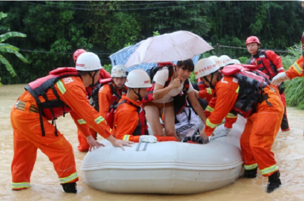 广西防城港市防城区文昌街道城南村立头西组的居民楼被洪水淹没,经过消防官兵大约4个小时的紧张救援,被困的群众被全部救出。