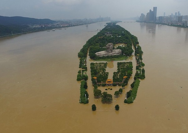 湘江中心的橘子洲景区道路被淹,景区关闭,橘子洲上人员撤离。