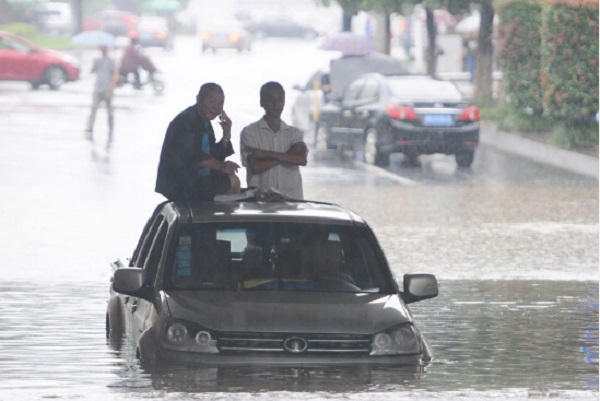 在江西九江开发区长江大道上,车辆在积水的路段熄火,车主爬上车顶等待救援